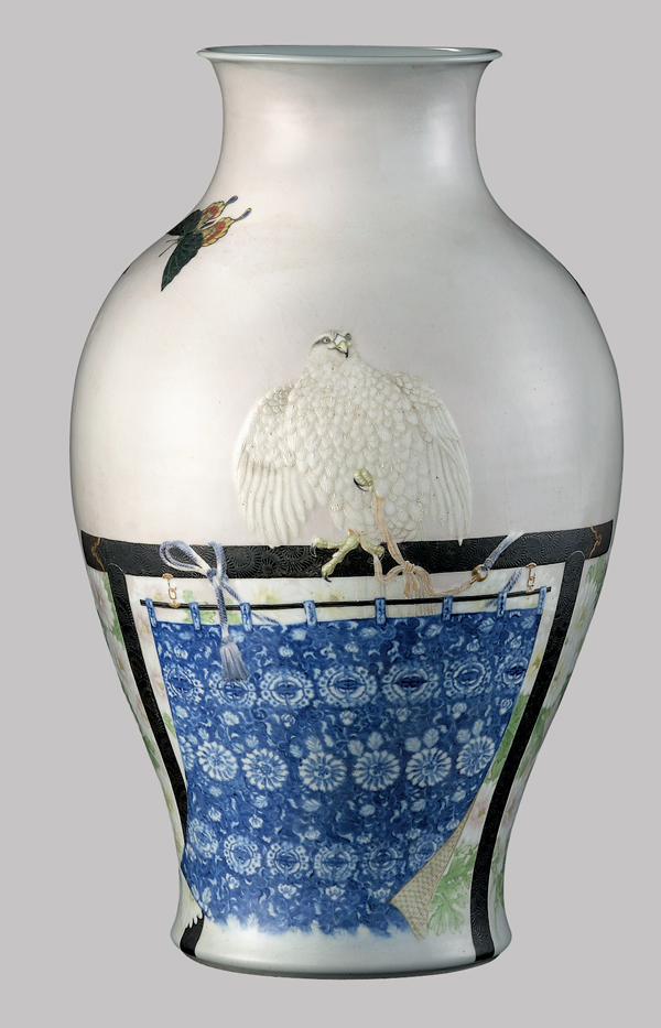 宮川香山 鷹止り木文釉下彩花瓶