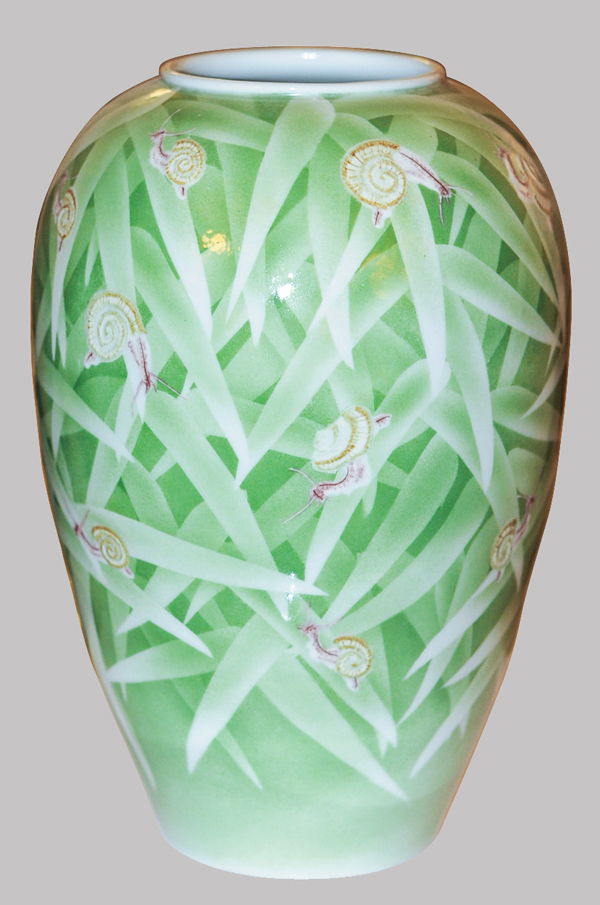 竹にかたつむり文釉下彩花瓶