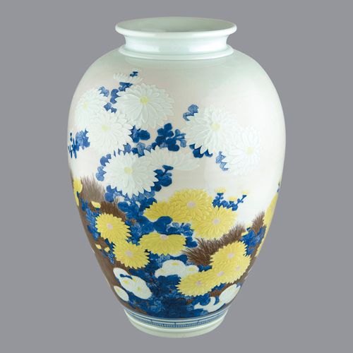 菊花柴垣浮文釉下彩染付壺